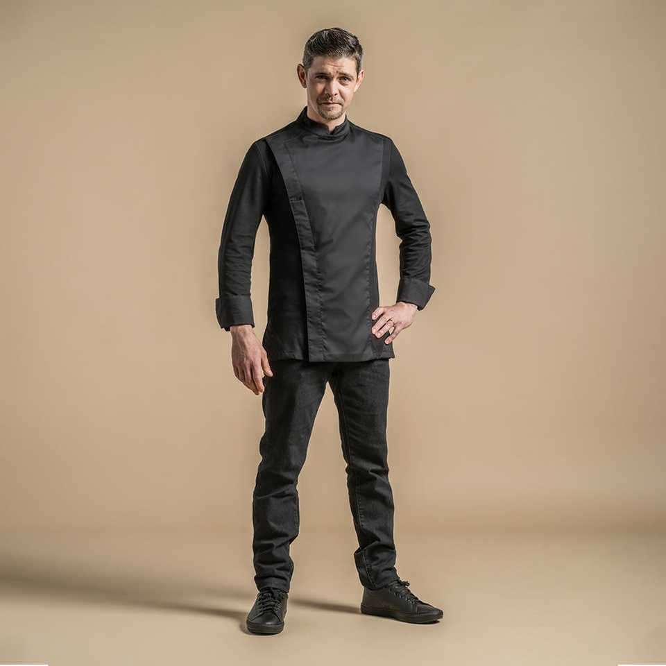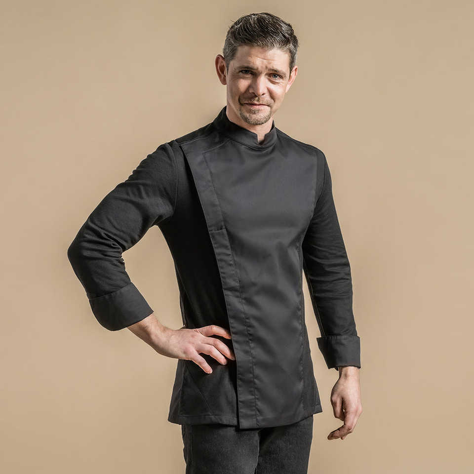 Veste de chef professionnelle pour homme sur mesure, col amovible, boutons-pression cachés, doublure respirante à dos sec, impression en relief