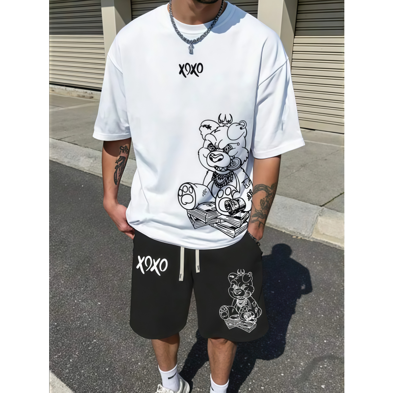 Ensemble de survêtement court vintage délavé avec impression en relief personnalisée, streetwear vintage, impression sérigraphiée avec strass et ensembles de t-shirts pour hommes