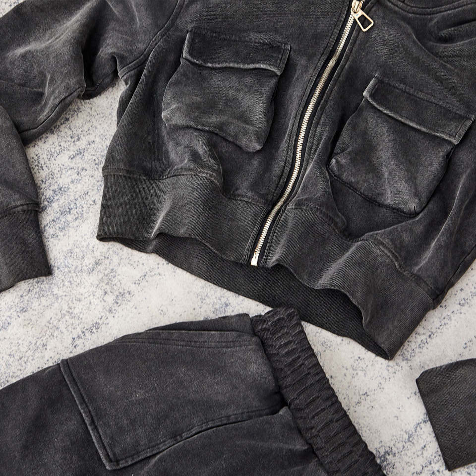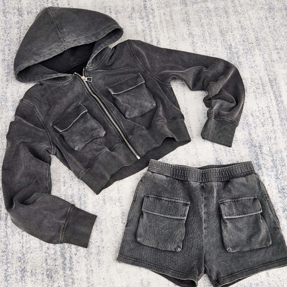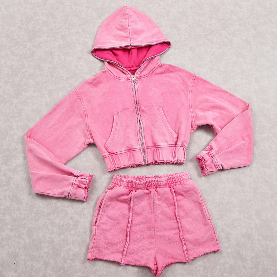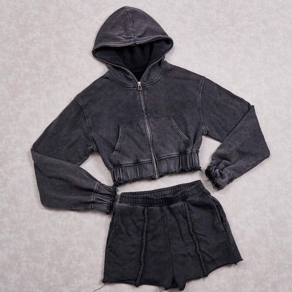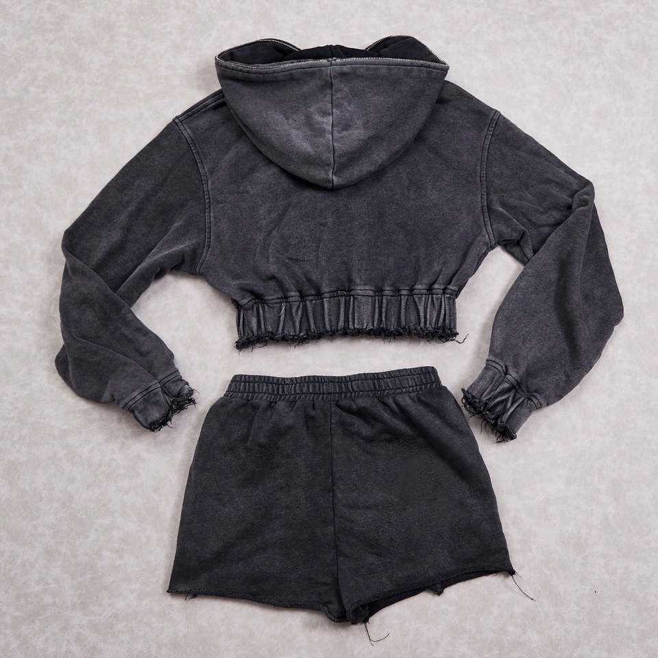 Ensemble décontracté deux pièces pour femme, sweat à capuche et short, couleur unie personnalisée, effet délavé et vieilli, brodé, style survêtement vintage