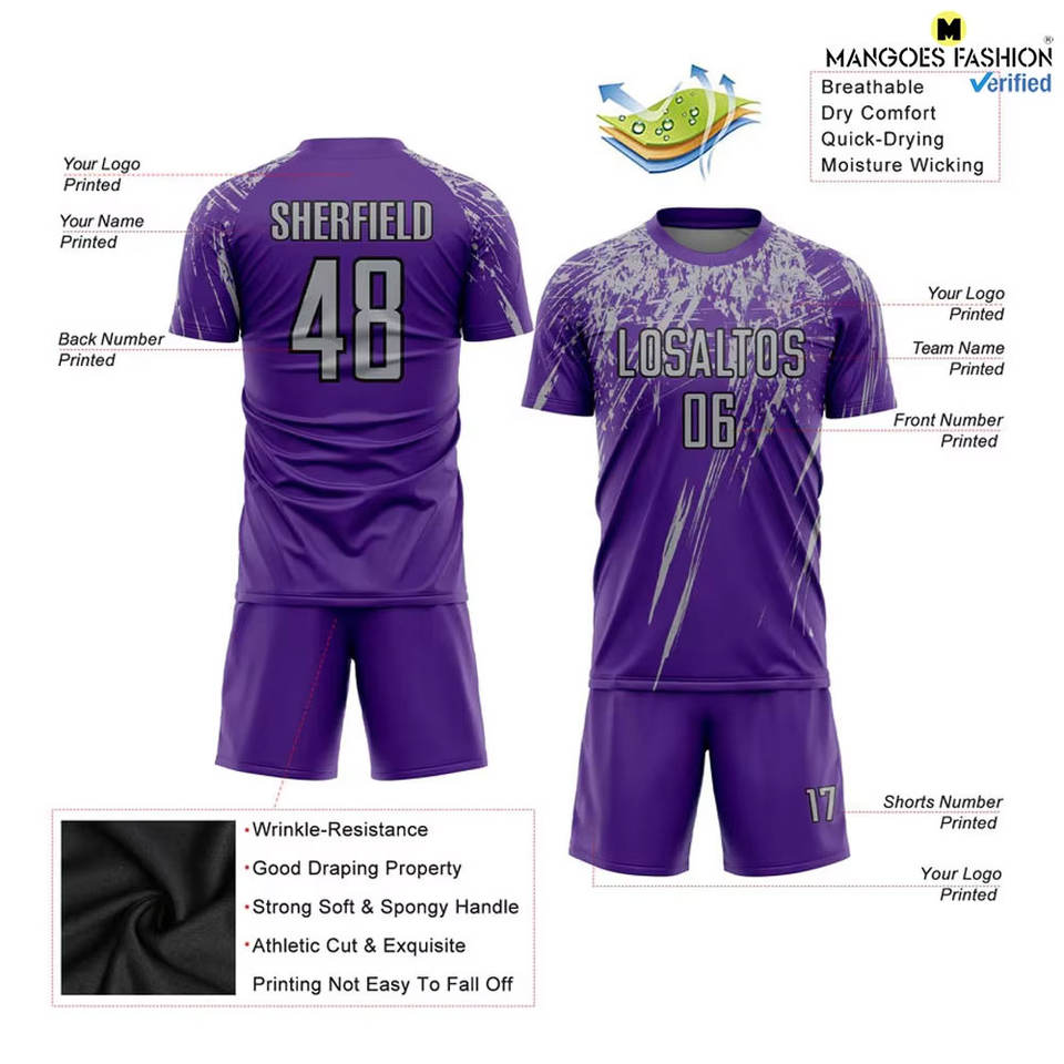 Uniforme de football personnalisé violet gris-noir, maillot, short, vêtements de sport, uniformes, fabricant d'usine