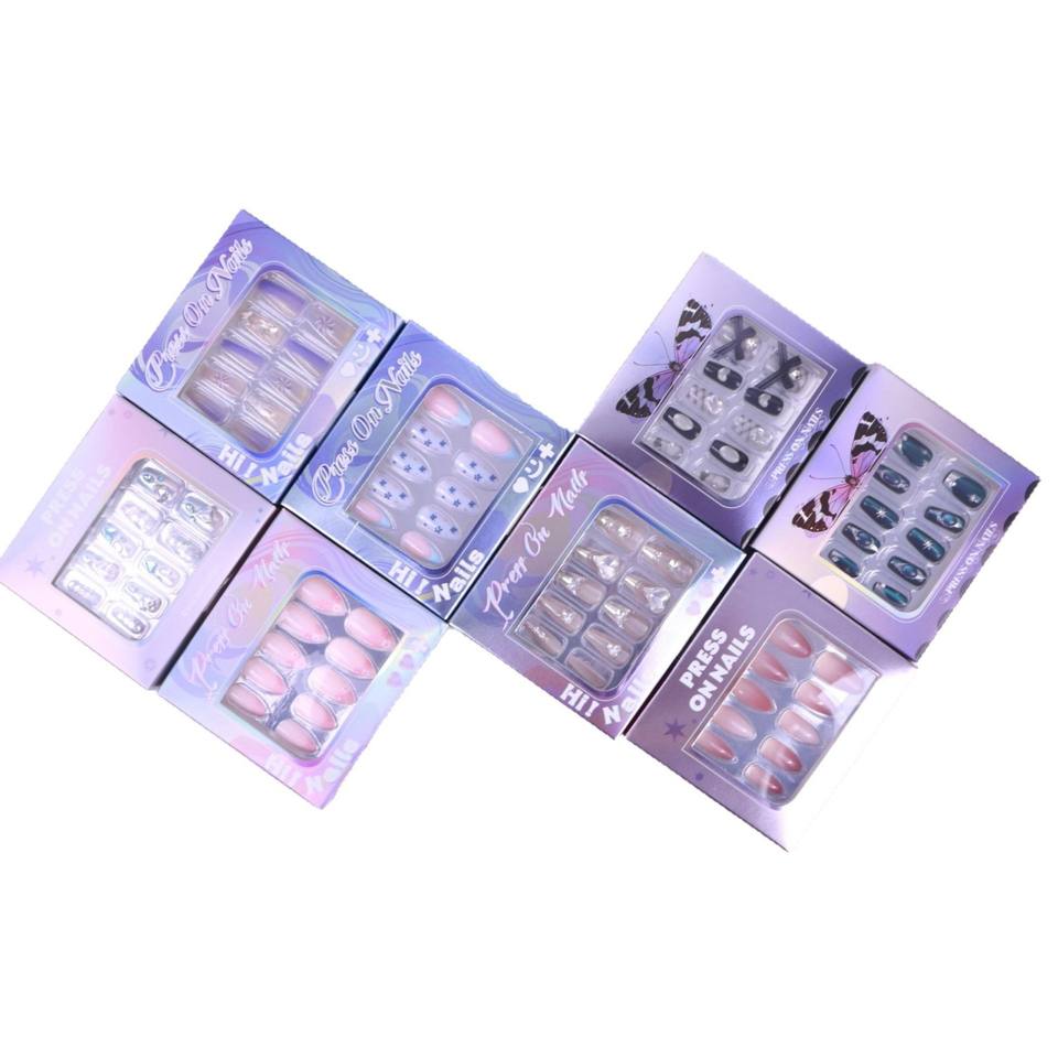 Boîte d'emballage anti-poussière en papier violet personnalisé pour ongles artificiels conception papillon presse à ongles organisateur d'affichage