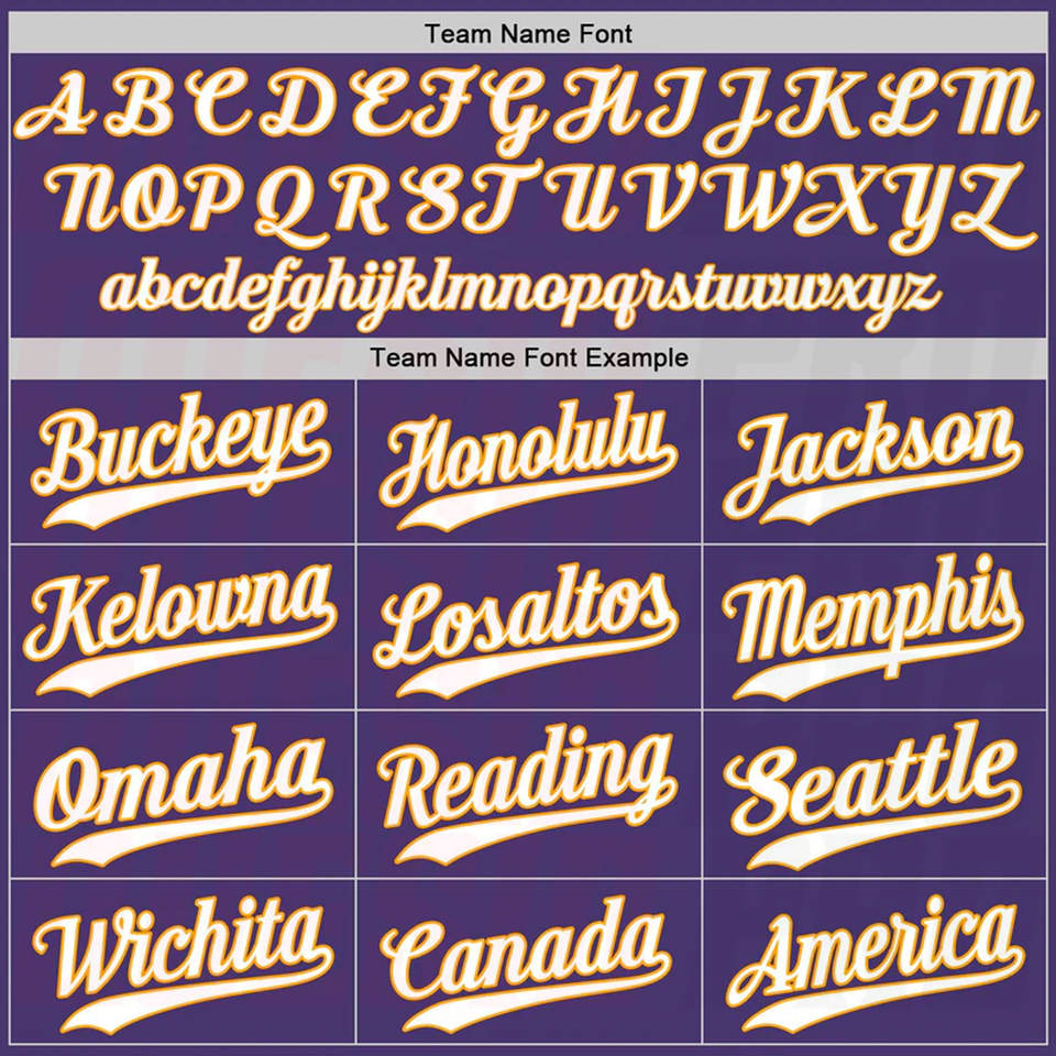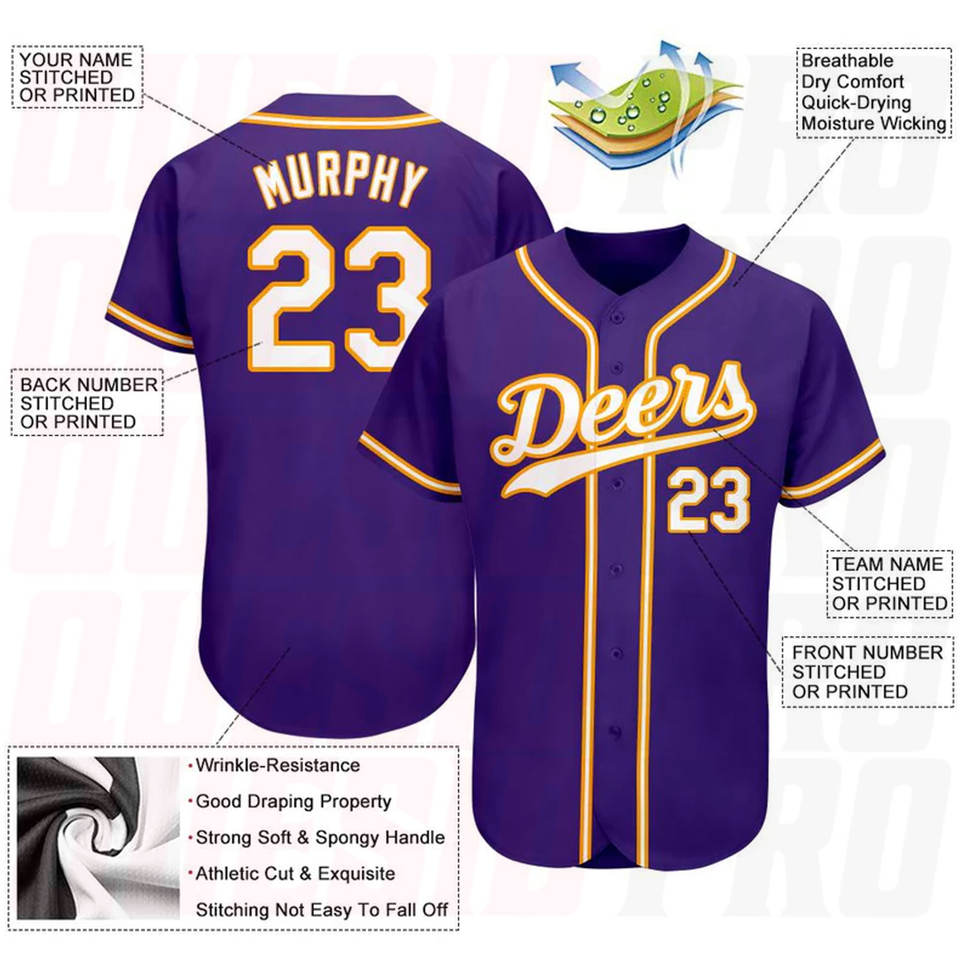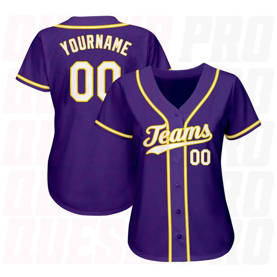 Maillot de baseball authentique personnalisé violet, blanc et or, impression par sublimation, conception de logo personnalisée, personnalisation des couleurs