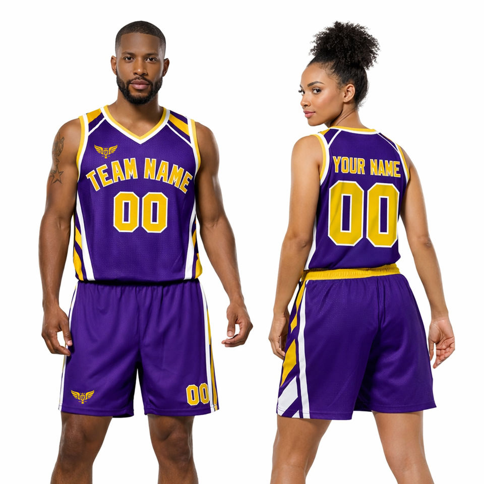 Ensemble d'uniformes de basket-ball personnalisés violet et jaune pour hommes et femmes, maillot sans manches en mesh et short, kit d'équipe avec nom et numéro personnalisés