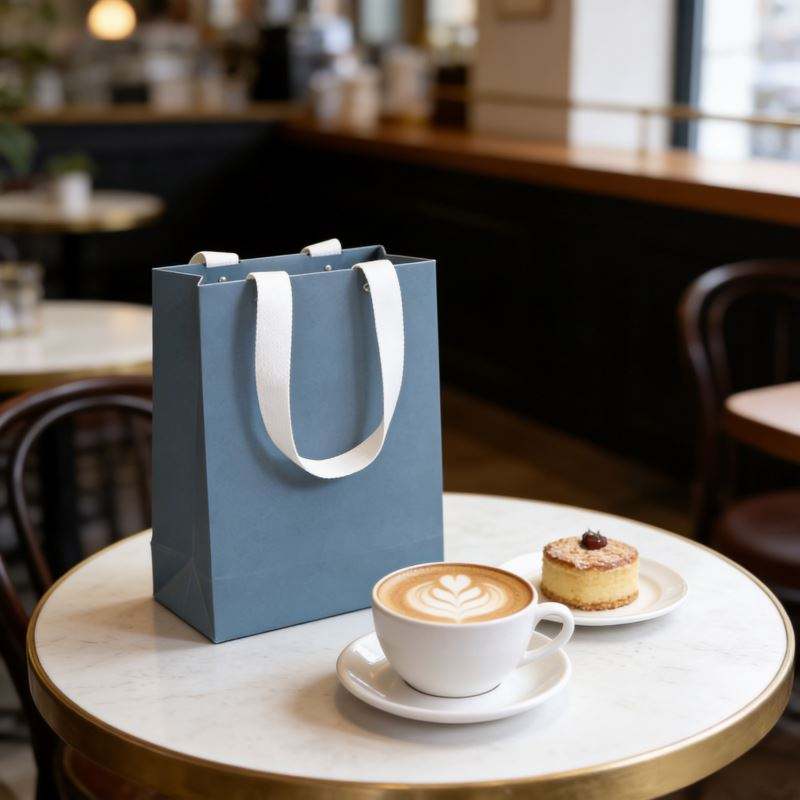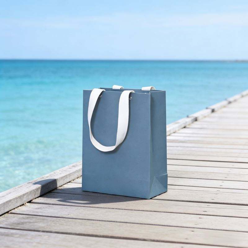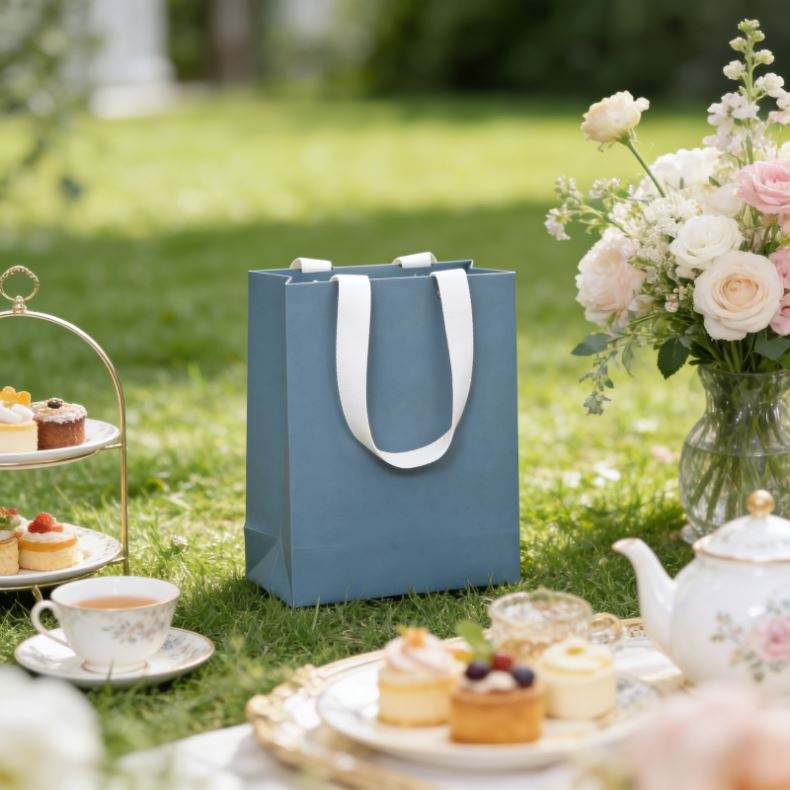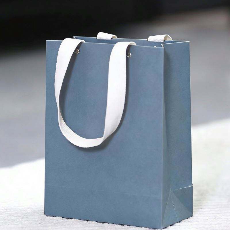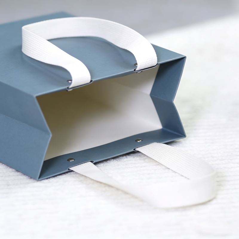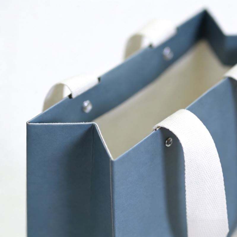 Sac en papier bleu pliable pour le commerce de détail, avec poignée en coton recyclé et design perforé à rivets, personnalisable