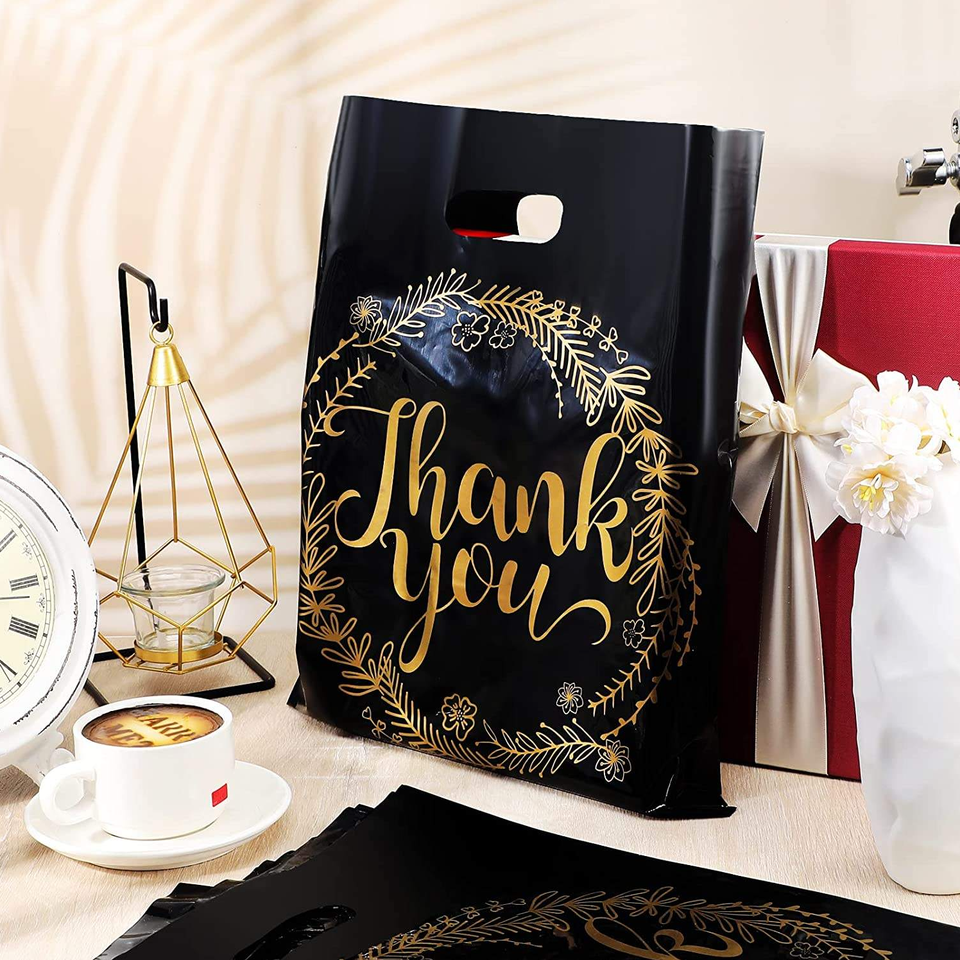 Sacs de shopping en plastique PE recyclable personnalisés avec soufflet latéral, poignée découpée, logo, pour chaussettes, vêtements, chaussures, vente en gros, entreprise, impression sérigraphique