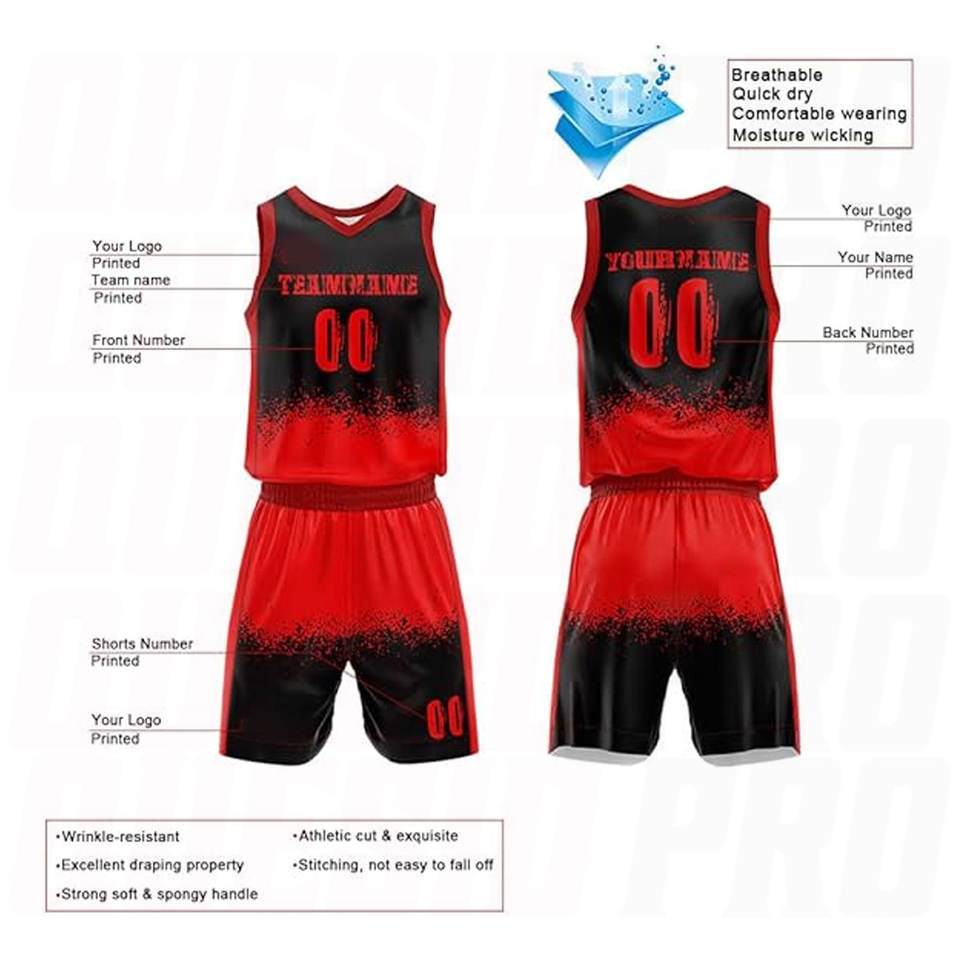 Ensemble de maillots de basket-ball personnalisés rouge-noir, imprimés numériquement, respirants et à séchage rapide pour hommes adultes