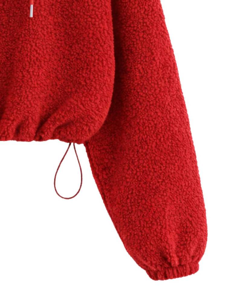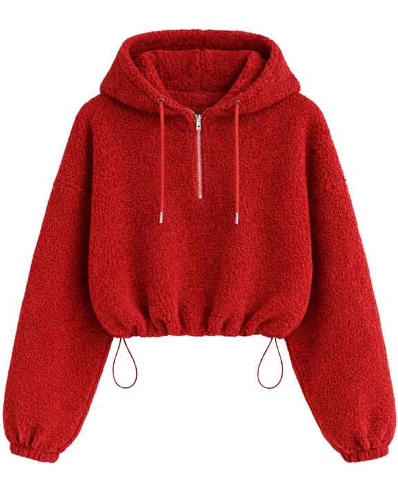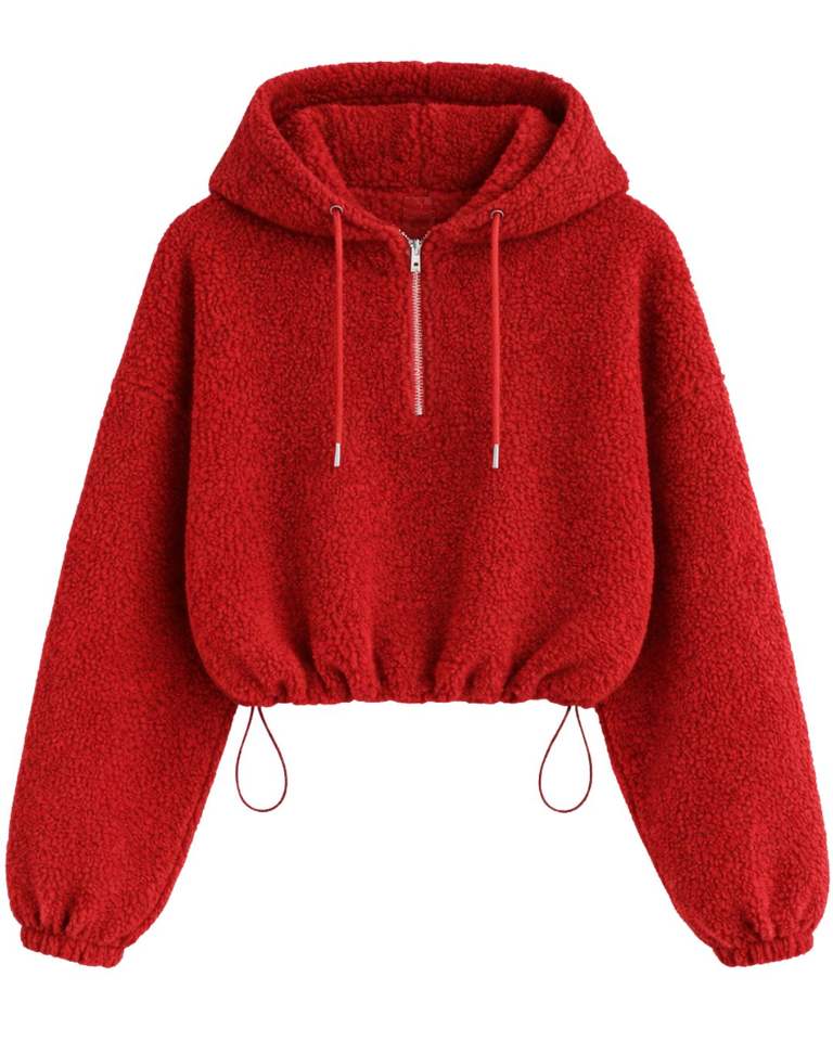 Sweat à capuche court en polaire texturée rouge personnalisé, avec fermeture éclair quart de tour, ourlet à cordon de serrage réglable, style streetwear décontracté, pull chaud pour homme, logo personnalisé