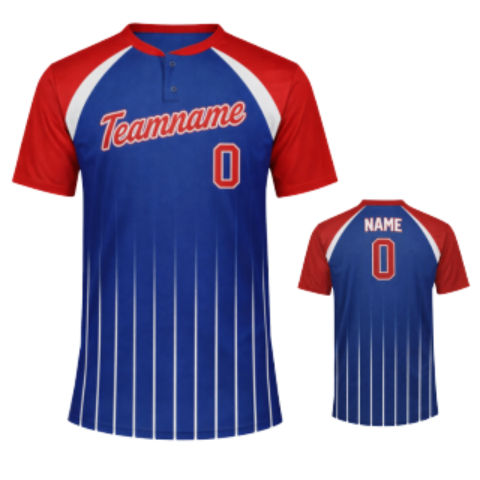 Maillot de baseball personnalisé rouge et bleu avec design boutonné, numéro de joueur personnalisé et couleurs d'équipe pour vêtements de sport pour hommes