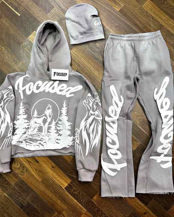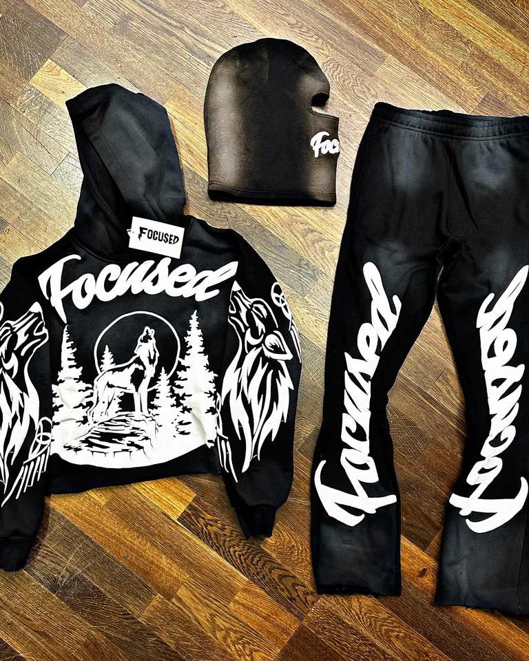Ensemble de survêtements d'hiver 2 pièces en molleton imprimé coupe droite personnalisée avec sweat à capuche zippé et pantalon de jogging évasé en coton