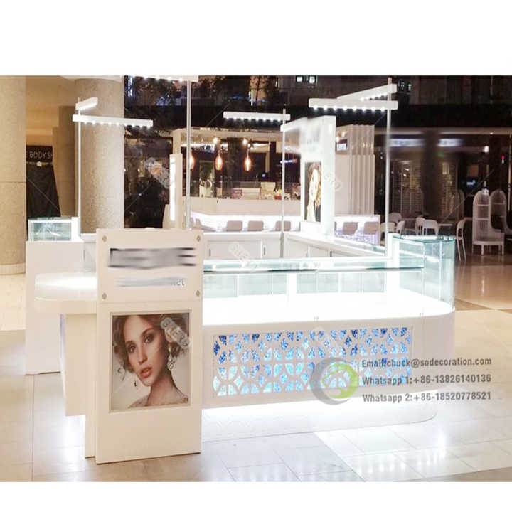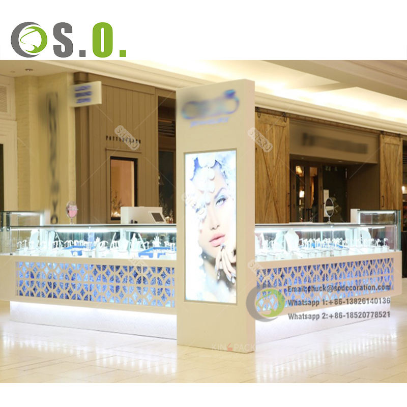 Présentoir de bijoux en verre au détail personnalisé, kiosque de bijoux à éclairage LED en bois verrouillable pour centre commercial