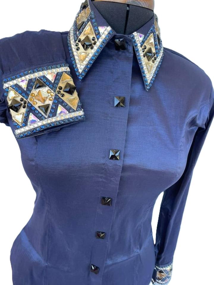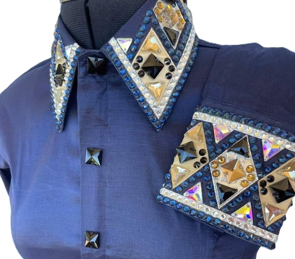 Chemise de spectacle rétro personnalisée Western Pleasure Blue Chemise de rail de reine de rodéo pour vêtements d'équitation pour femmes