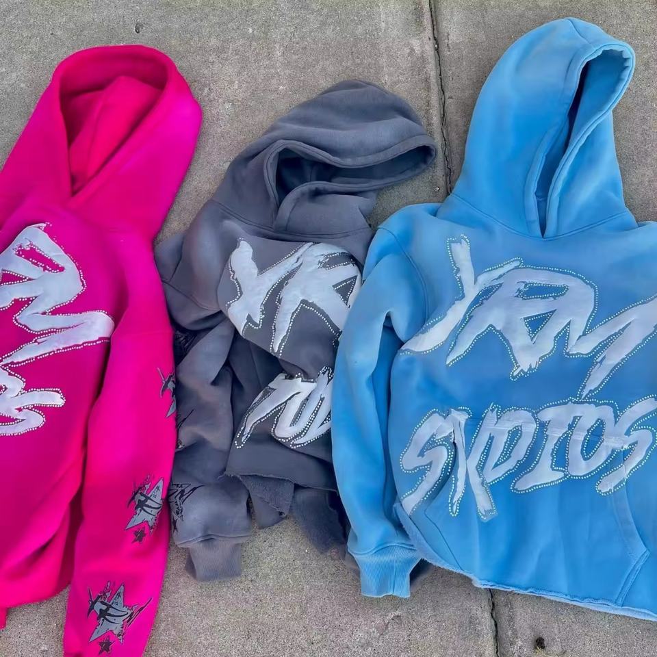 Ensemble de survêtement pour homme avec sweat à capuche et pantalon de jogging, imprimé strass personnalisé, bords bruts coupés, coupe évasée et effet empilé