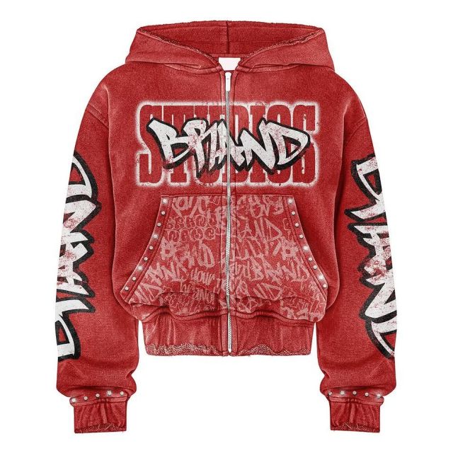 Sweat-shirt vintage pour femme, coupe oversize, avec logo imprimé personnalisé en strass, ourlet brut, délavage à la pierre, fermeture éclair frontale, idéal pour l'hiver