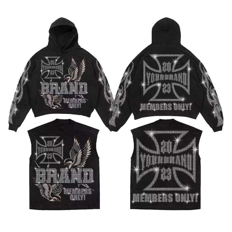 Ensemble sweat à capuche zippé et pantalon de survêtement oversize pour homme, avec strass personnalisés, coupe courte, effet vieilli, idéal pour l'hiver