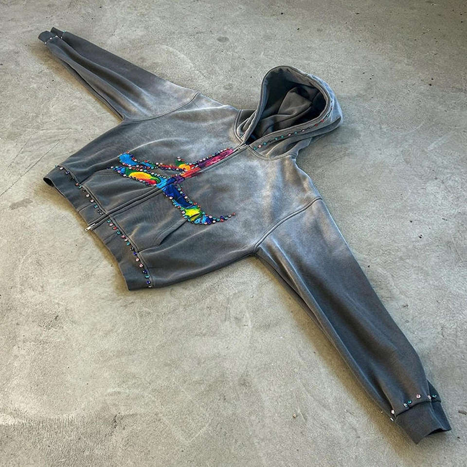 Sweat à capuche zippé en strass personnalisé pour hommes 370 grammes lavage à l'acide Streetwear sérigraphie Logo coton lourd mode haut à capuche automne coupe ajustée