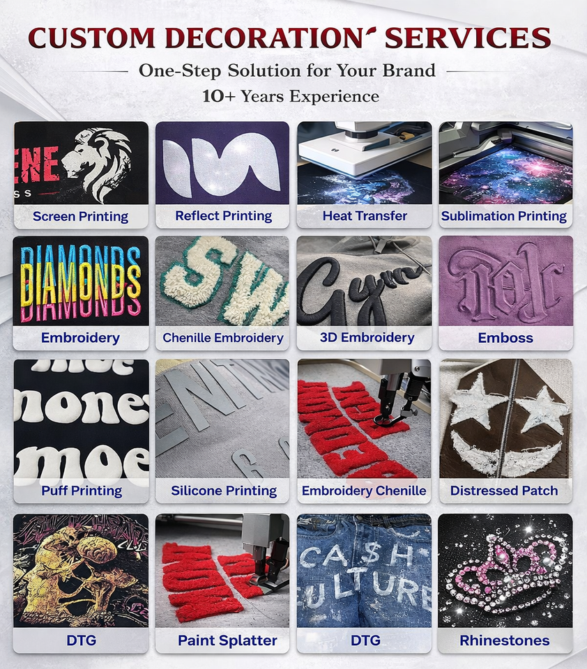 Brodé, Imprimé, Lavé, Teint clair, Puff Imprimer, Broderie 3D, Lavage acide, Strass