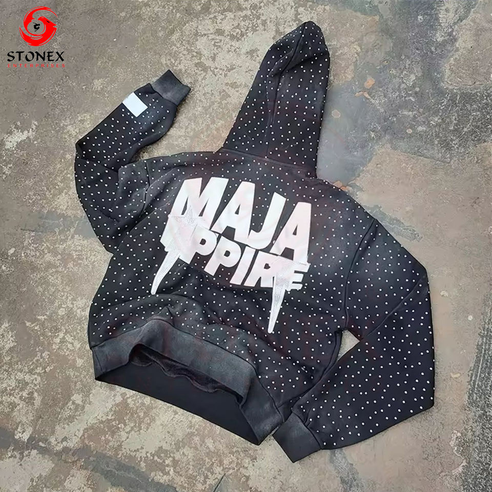 Sweat à capuche zippé avec logo et strass personnalisé OEM Vêtements de jogging pour hommes Ensemble de sweat-shirt 2 pièces Pantalon de survêtement et sweat à capuche Ensemble de survêtements pour hommes