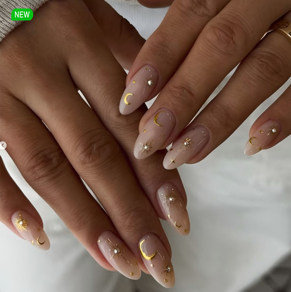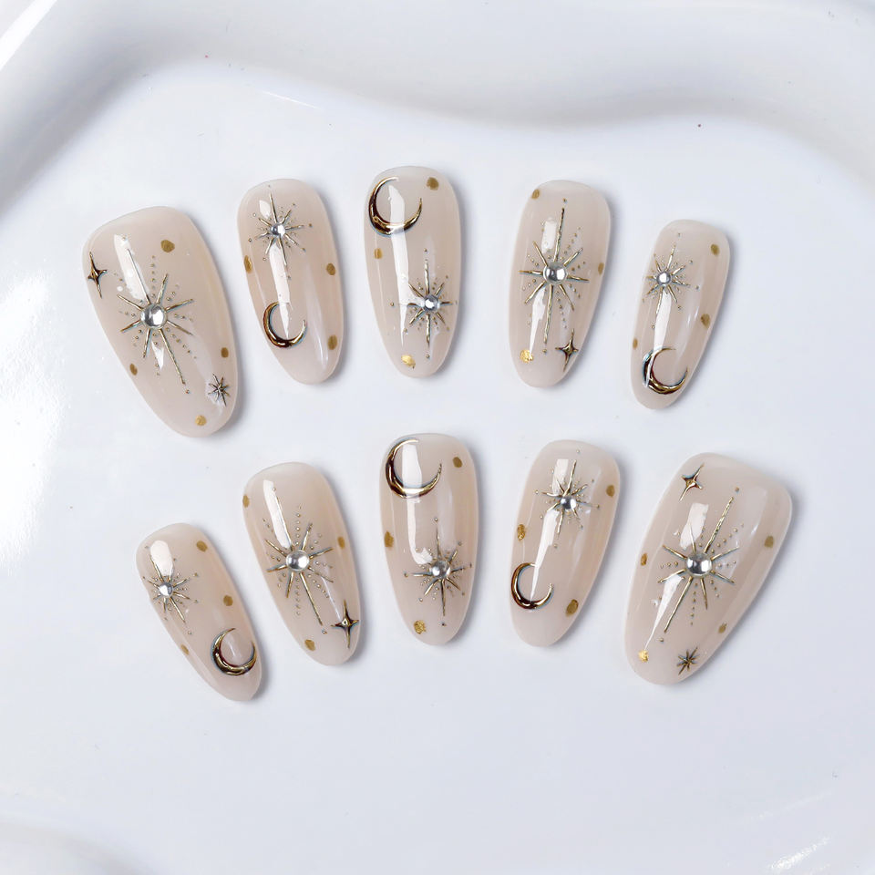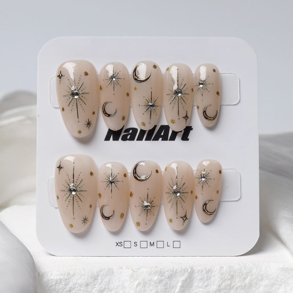 Faux ongles à presser personnalisés en acrylique, motif étoile et lune, faits main, style bohème, forme amande, réutilisables, à coller sur les doigts