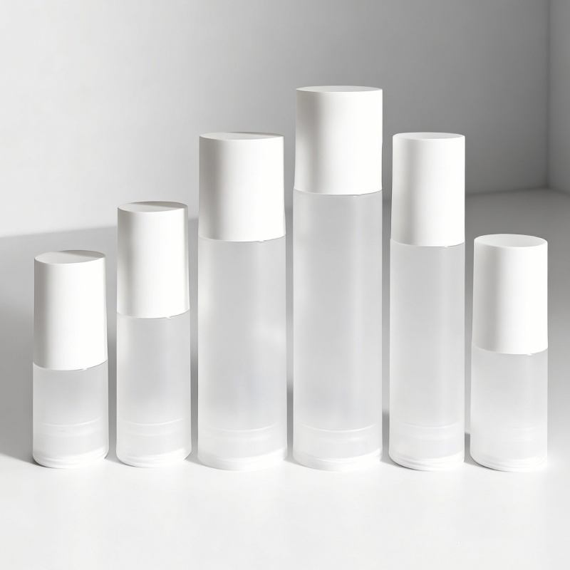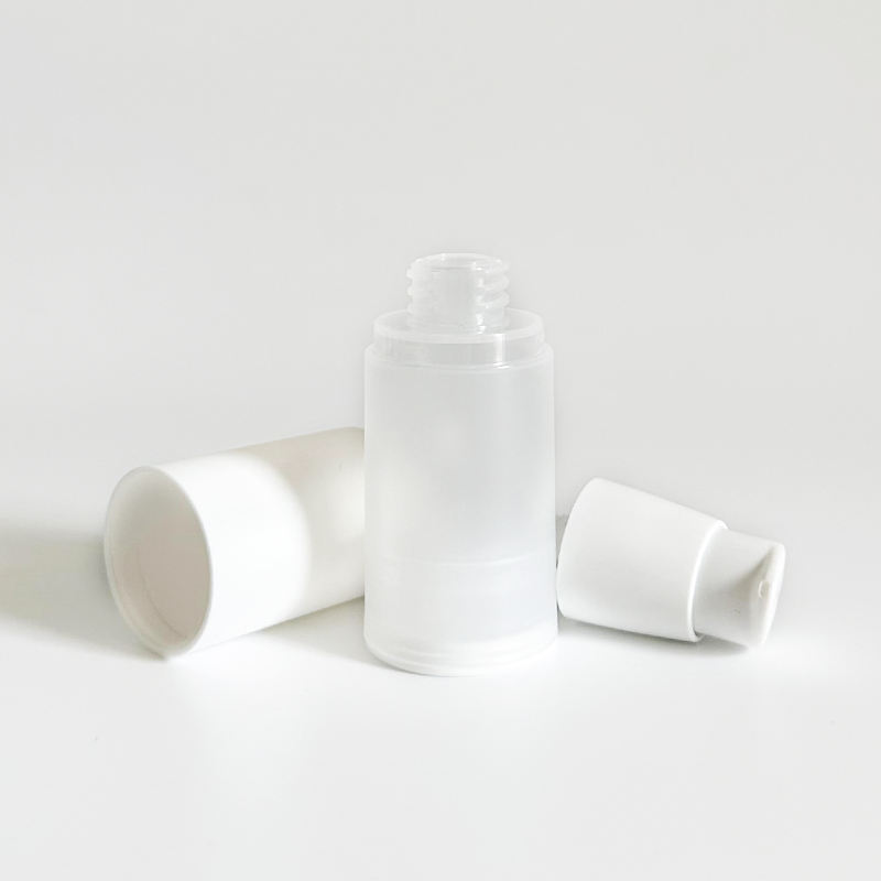 Flacon pompe sans air en plastique givré rond personnalisé de 15 ml à 100 ml, flacon sans air en plastique pour essence pour les yeux avec bouchon blanc