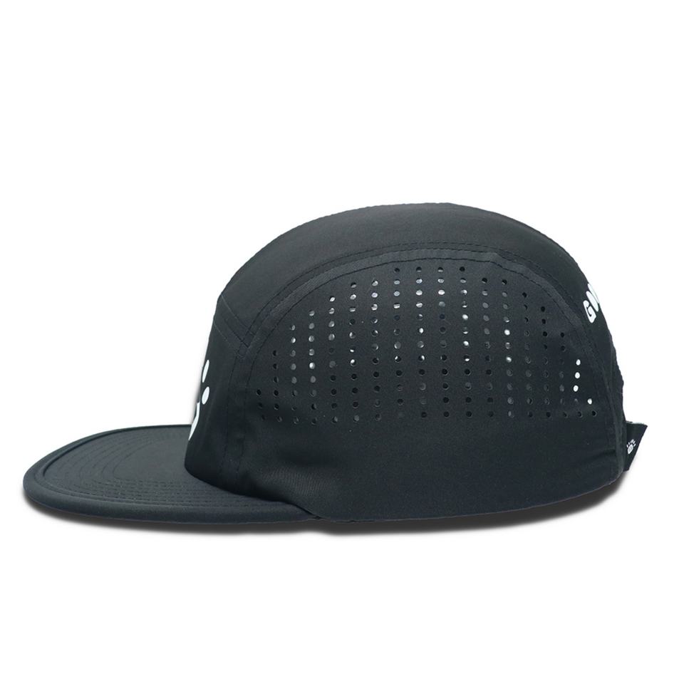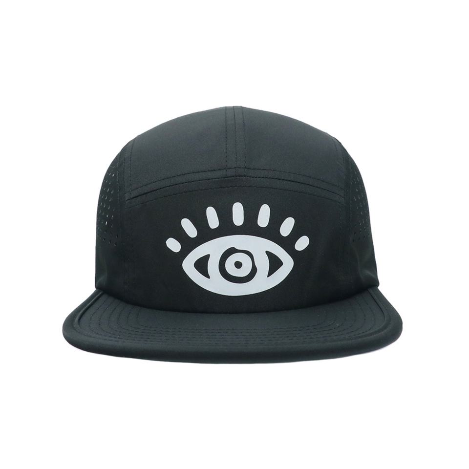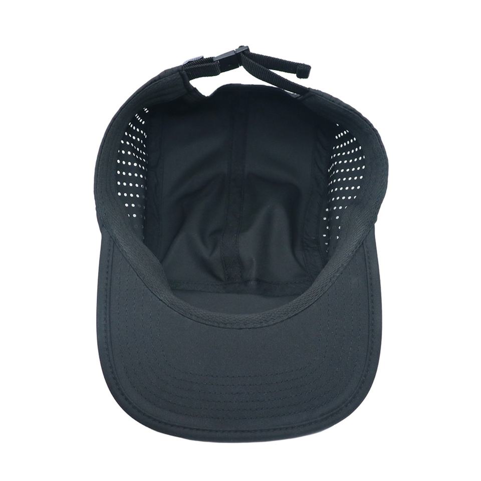 Casquette sportive 5 panneaux noire en tissu imperméable avec logo personnalisé en caoutchouc, style urbain, protection solaire extérieure, visière plate, toutes saisons