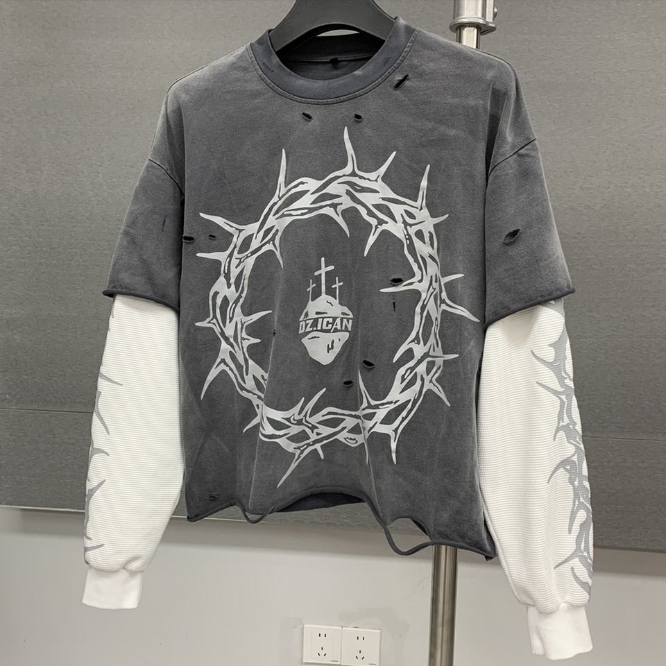 T-shirt Homme Ample Personnalisé à Sérigraphie, Coton Lavé 300 g/m², Style Streetwear Vintage Effet Délavé à l'Acide, Double Épaisseur, Manches Longues