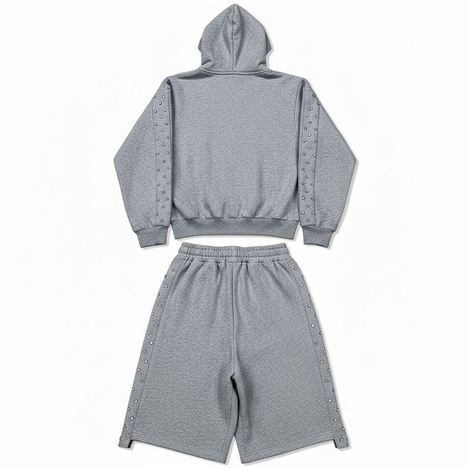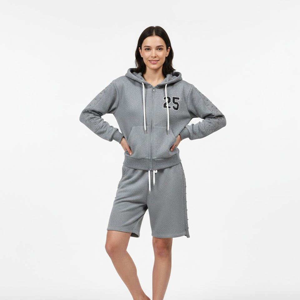 Ensemble survêtement tendance à capuche et clouté, imprimé sur mesure, en molleton 100 % coton, veste zippée et short deux pièces