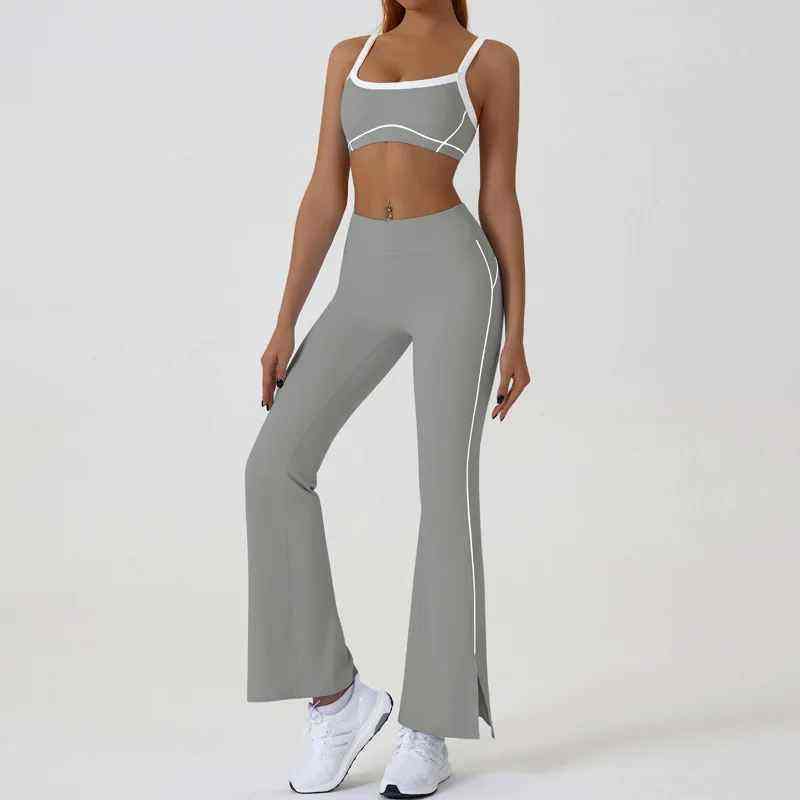Ensemble de yoga sans couture personnalisé soutien-gorge à épaules fines imprimé teint par cravate pantalon micro-évasé en tissu nu PCS-R-259 de yoga en plein air de couleur contrastée