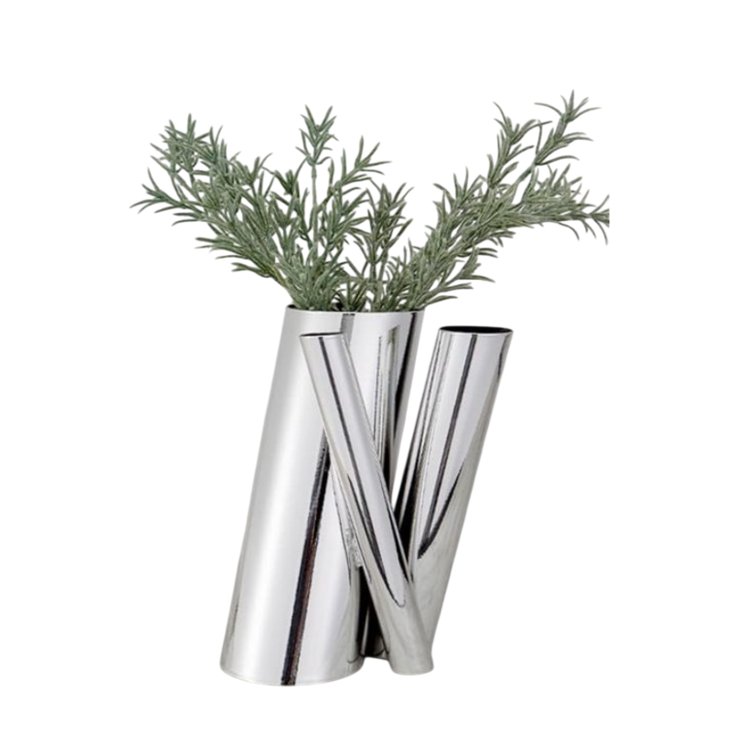 Vase à fleurs en métal de forme personnalisée avec finition argentée pour la décoration de la maison, du salon, du bureau ou du bureau à domicile.
