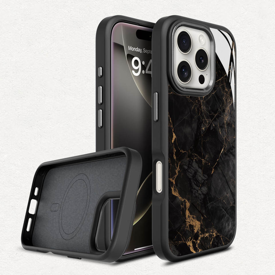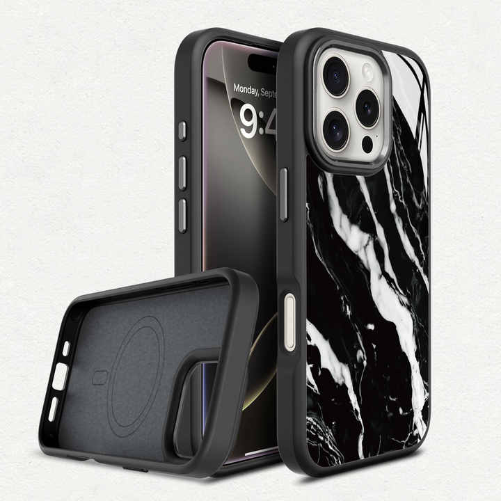 Coque personnalisée antichoc en verre trempé anti-jaune, motif marbre noir, coque de téléphone magnétique pour iPhone 16 Pro Max