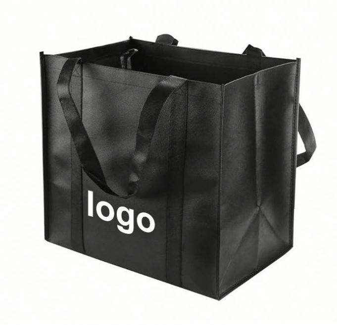Sac en tissu non tissé en polypropylène noir renforcé, réutilisable, avec poignée robuste, personnalisable pour le shopping