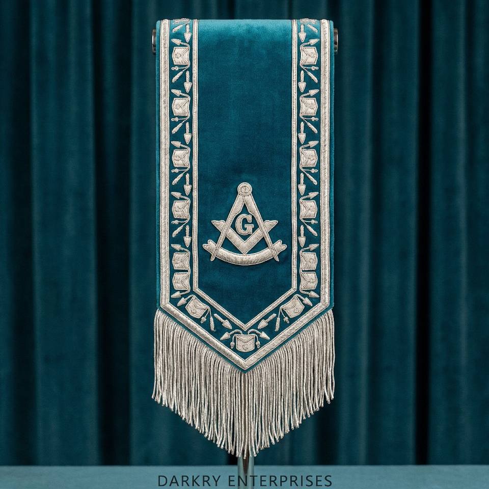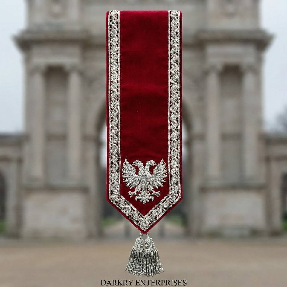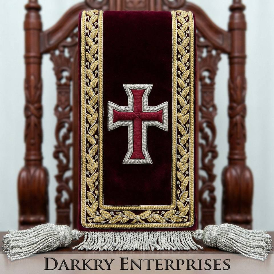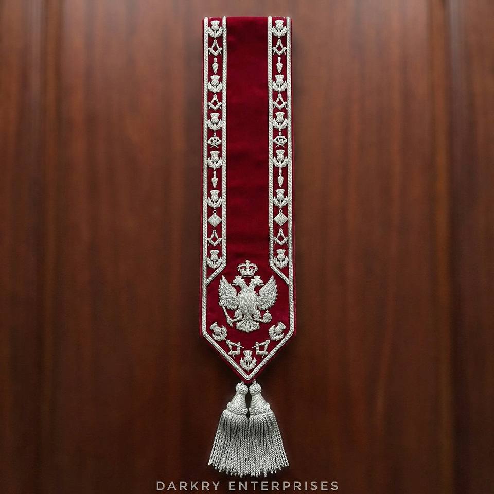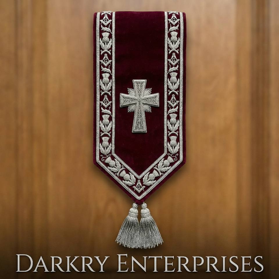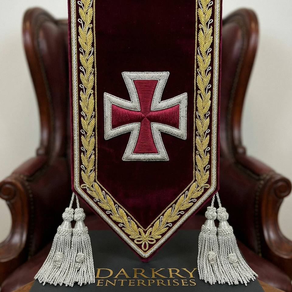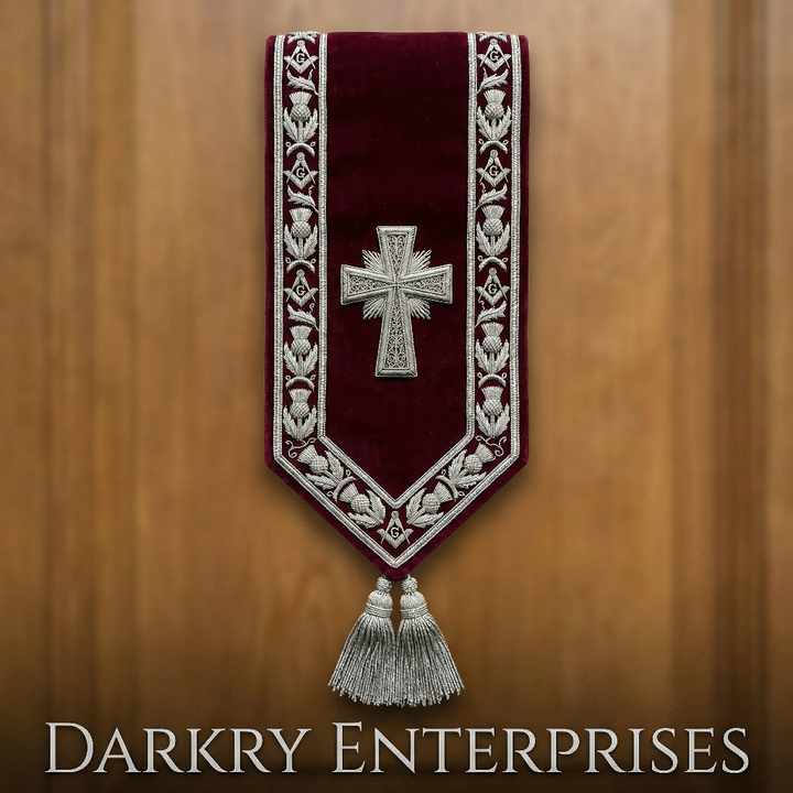 Écharpe maçonnique personnalisée en velours bordeaux avec broderie en fil d'argent, croix celtique et motif épi de blé, ornée de franges et pompons faits main