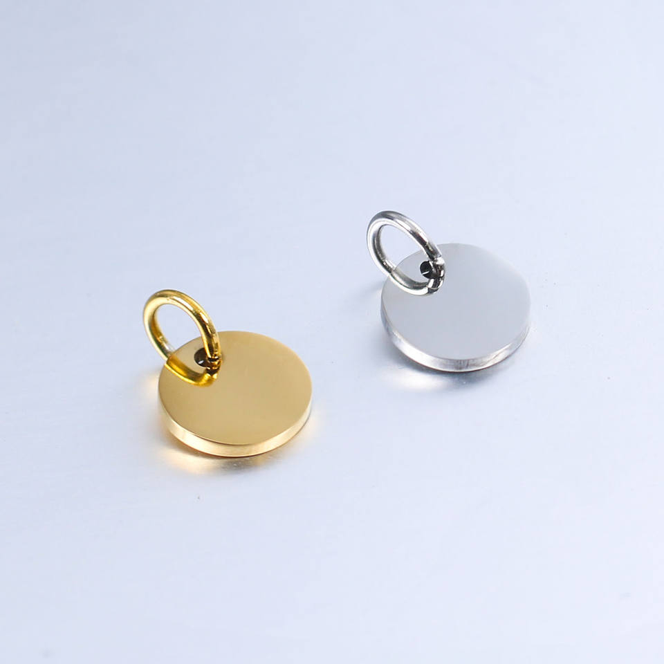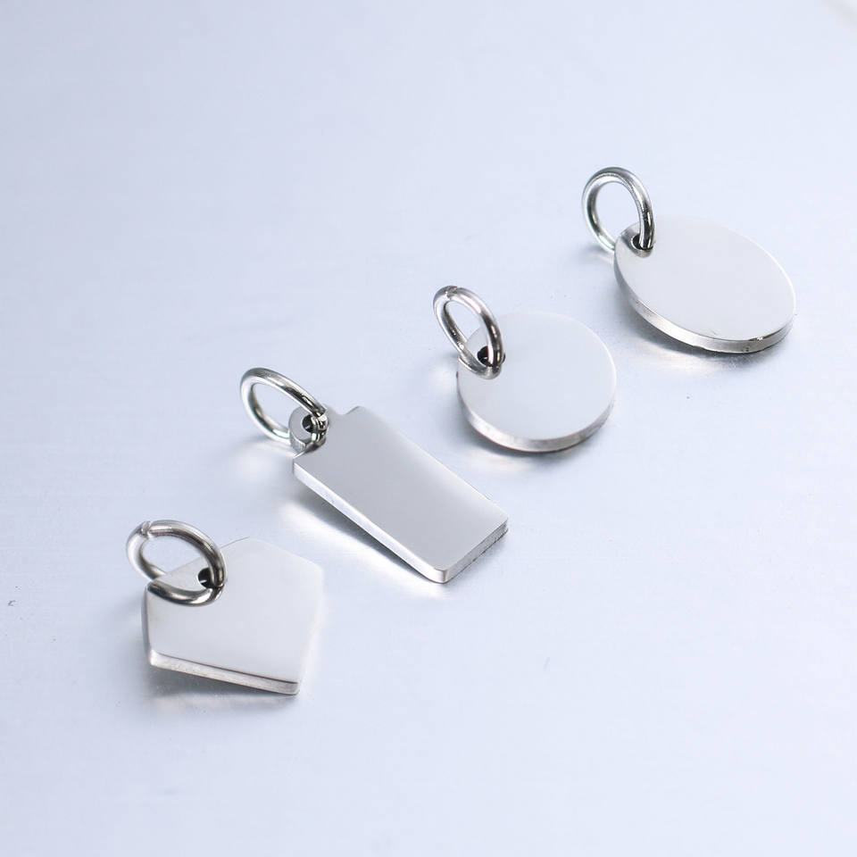 Étiquettes personnalisées en acier inoxydable plaqué argent avec logo en relief poli 25mm 30mm moulage plaque signalétique pour la fabrication de bijoux décoration de la maison