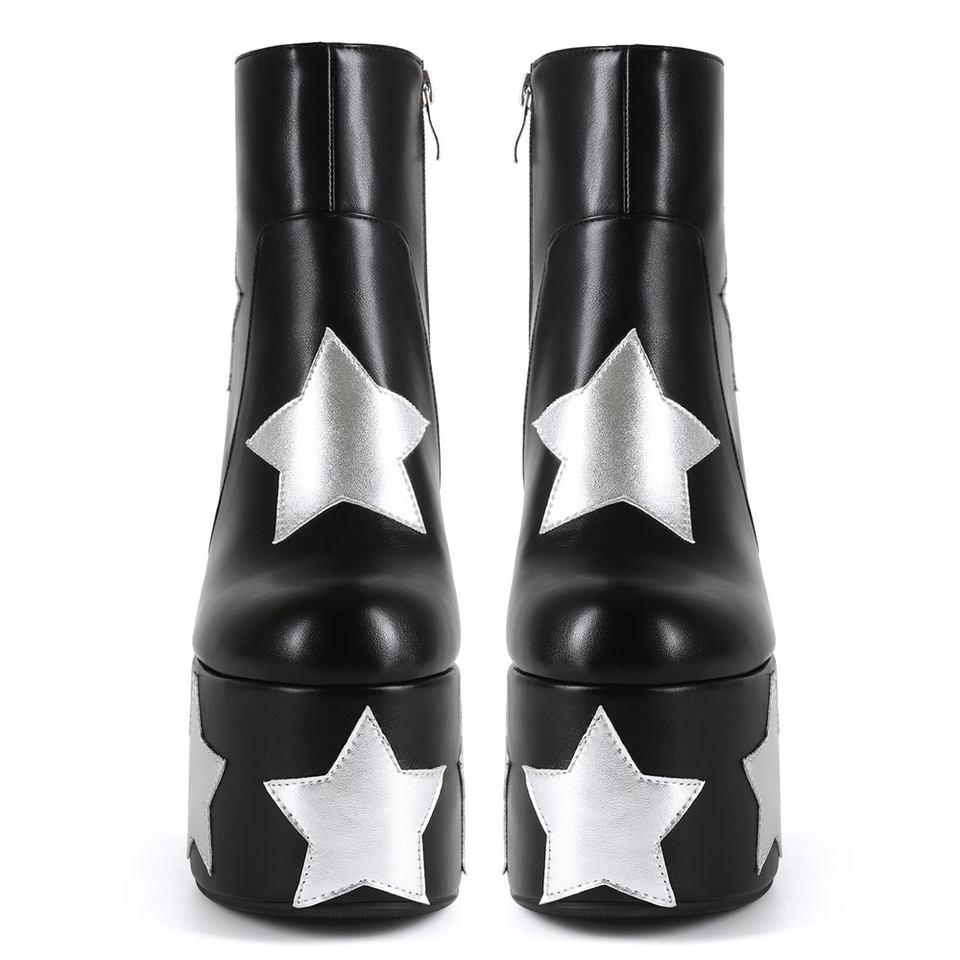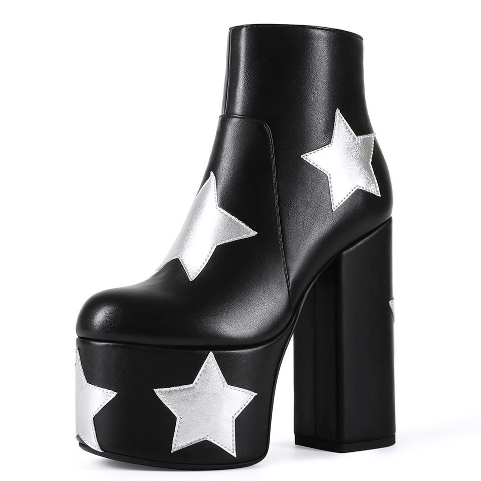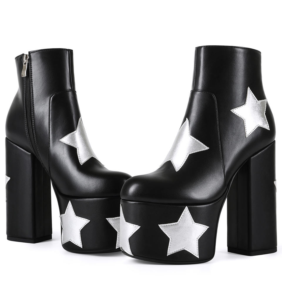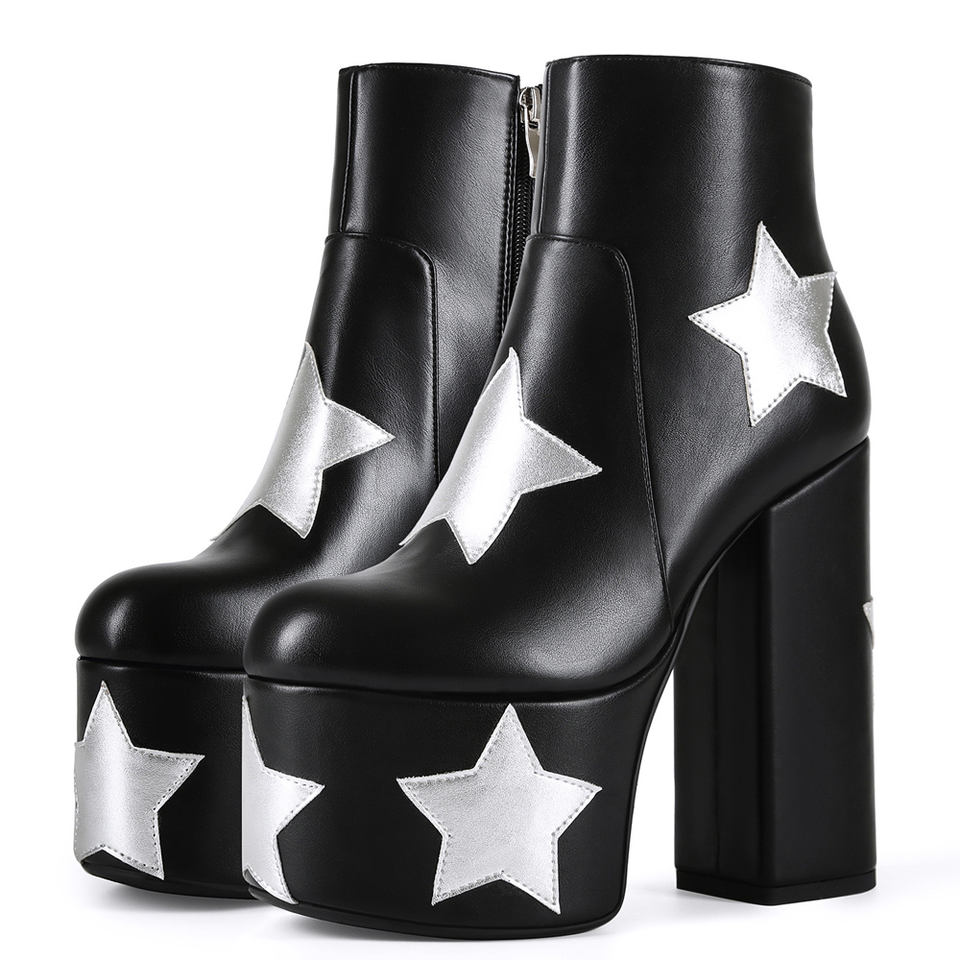 Bottines courtes à bout rond avec étoiles argentées personnalisées, plateforme épaisse, fermeture éclair latérale, talons hauts épais pour femmes, grande taille 47, bottines à la cheville