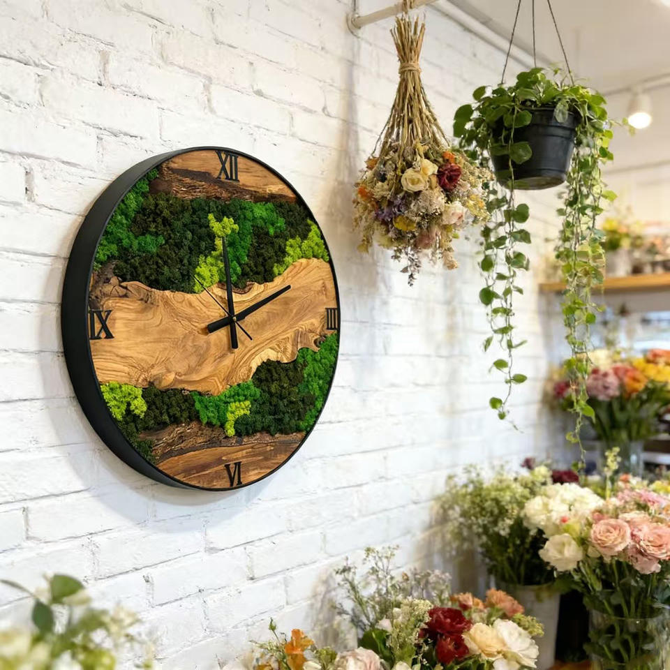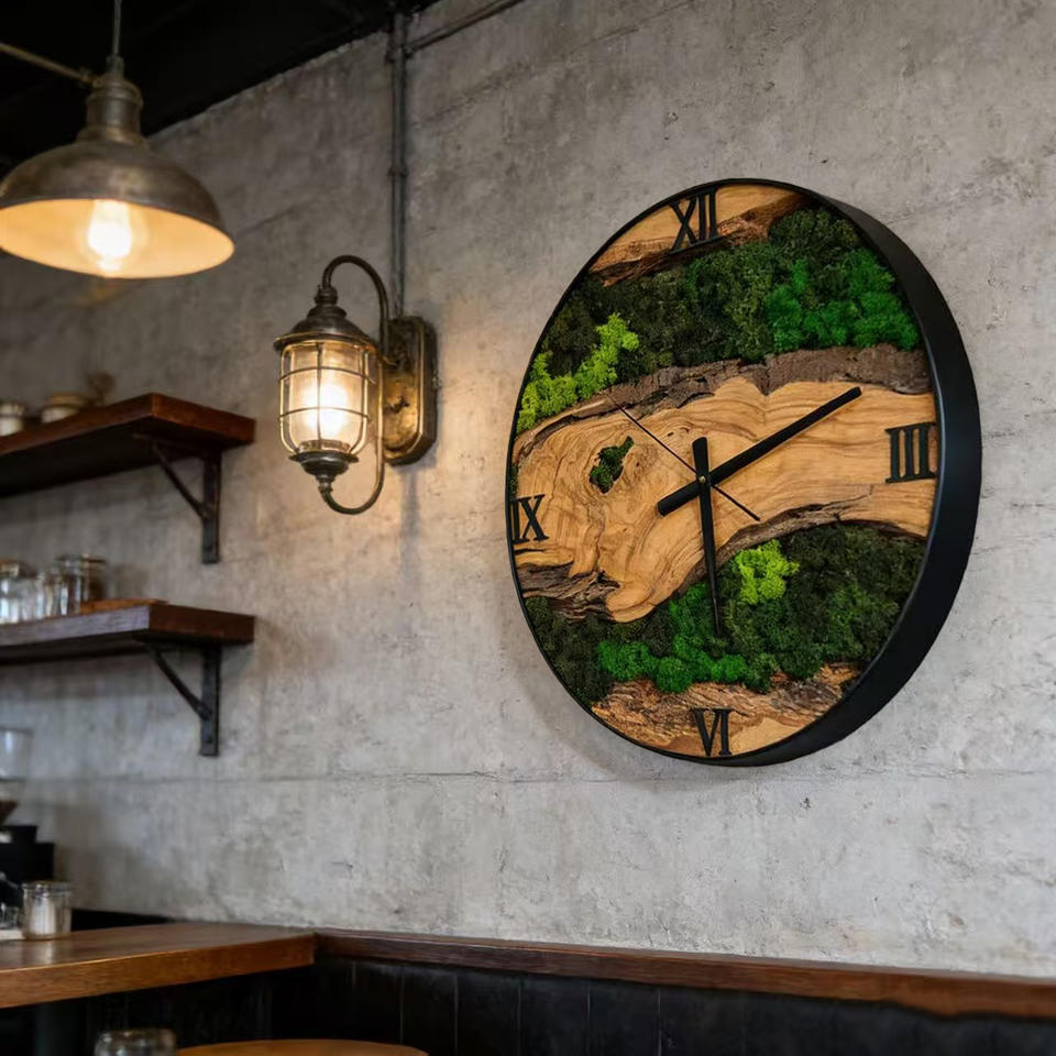 Horloge murale en mousse naturelle sur mesure avec bois d'olivier, décoration rustique écologique faite à la main pour la maison, le bureau, l'hôtel, horloge en mousse