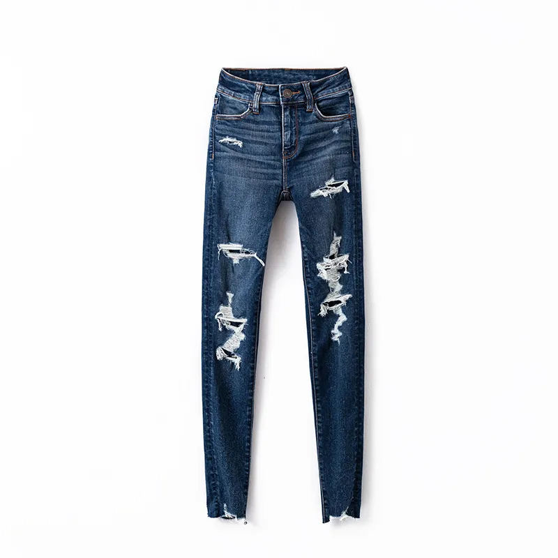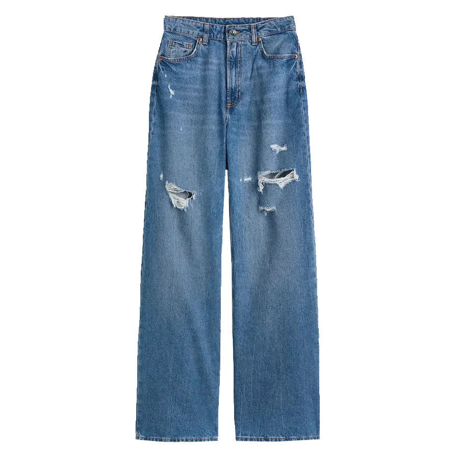 Jean en denim à jambe large personnalisé, nouveau design, pour femme, déchiré, super usé, couleur unie, délavé à l'acide, respirant, écologique