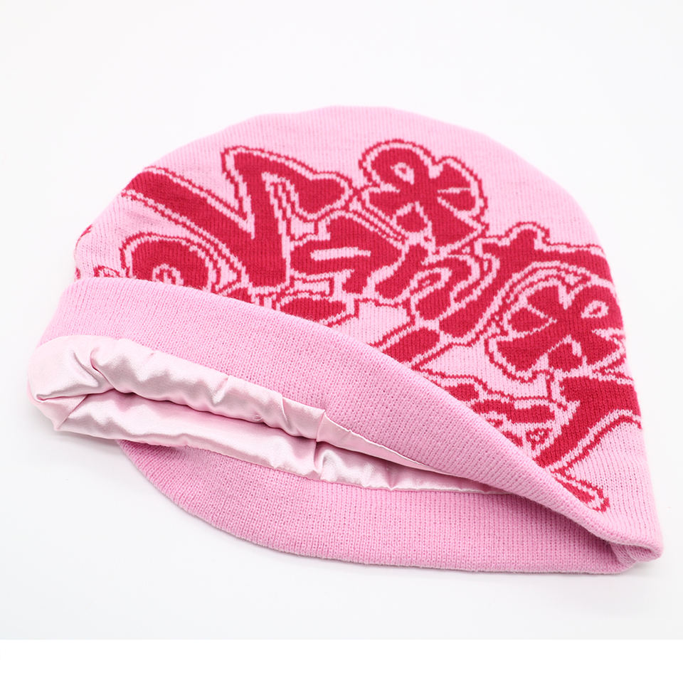 Bonnet personnalisé sans revers 100% laine avec doublure en satin, bonnet d'hiver chaud en tricot jacquard doublé de soie