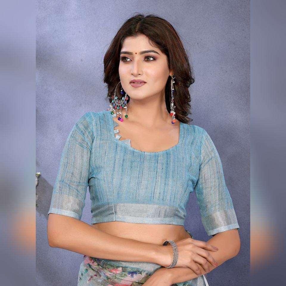 Sari en lin à imprimé floral multicolore bleu ciel personnalisé, préférablement GG-409, collection ethnique florale colorée