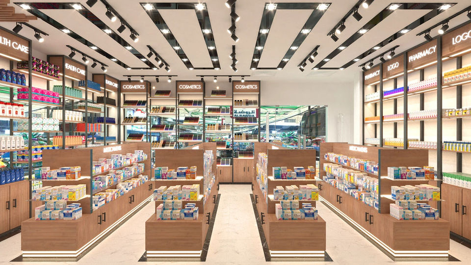 Étagères et vitrine de gondole de pharmacie éclairées par LED de conception de meubles de petite pharmacie