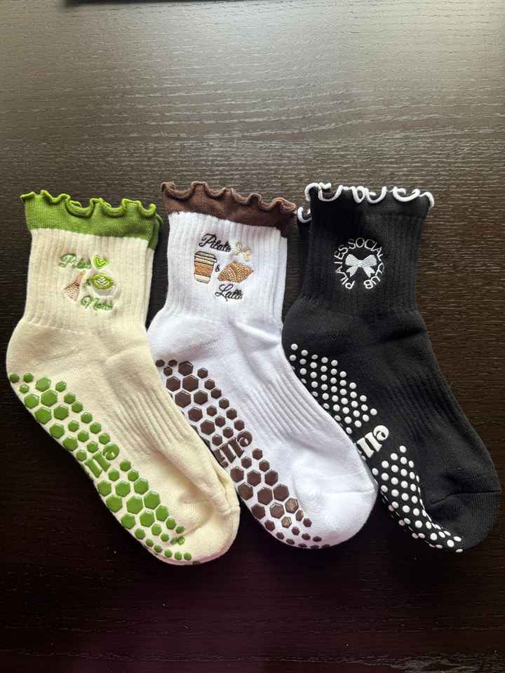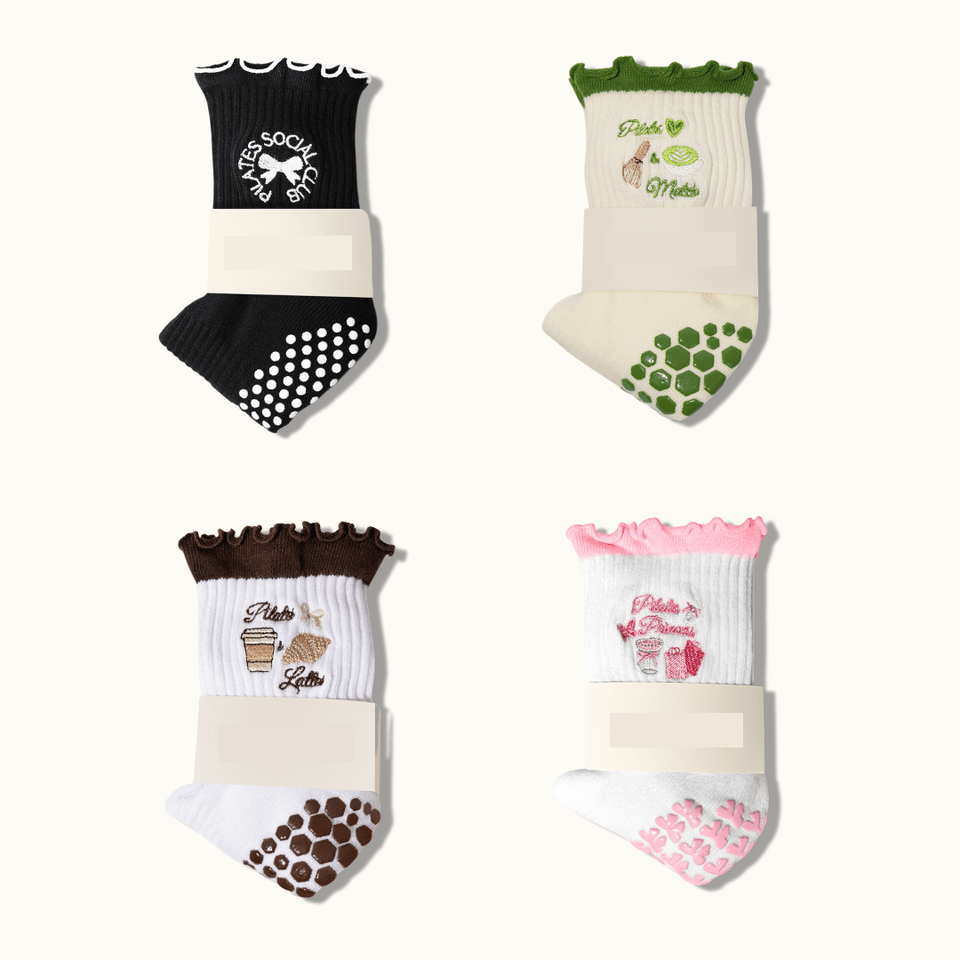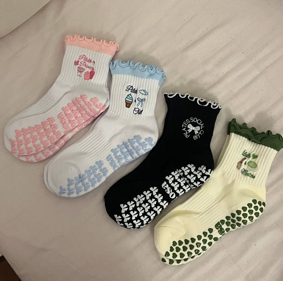 Chaussettes de yoga antidérapantes en coton doux personnalisées, logo brodé miniature personnalisé avec bordure à volants, chaussettes de Pilates pour femmes