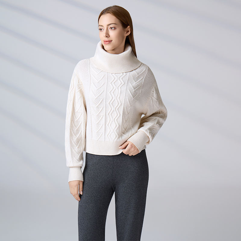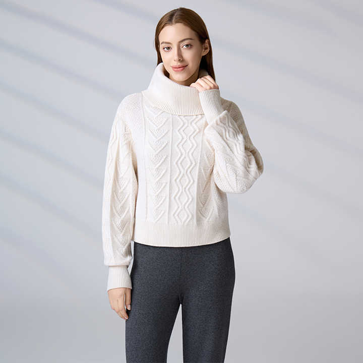 Pull col roulé en maille torsadée blanc uni personnalisé, coupe ample et confortable, collection Automne Hiver 2026 pour femme