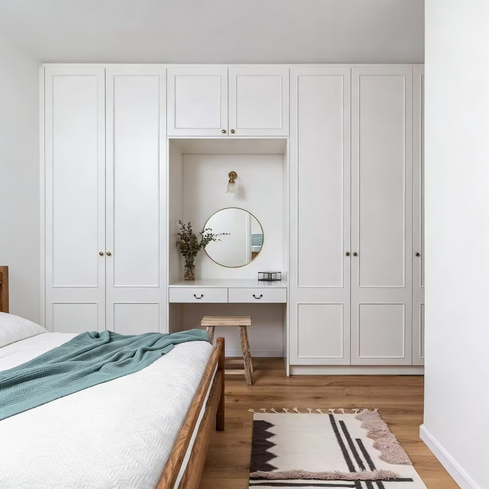 Armoire en bois massif sur mesure avec coiffeuse, ensemble de meubles de chambre à coucher moderne, placard à portes battantes et miroir combiné