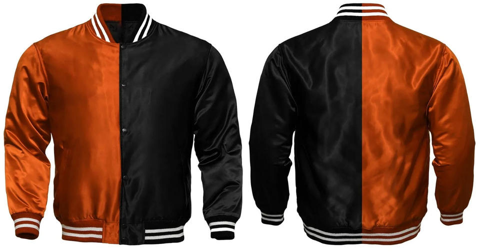 Veste universitaire en satin bicolore personnalisée pour homme, orange et noir, style bomber, uniforme de baseball Letterman, vente en gros