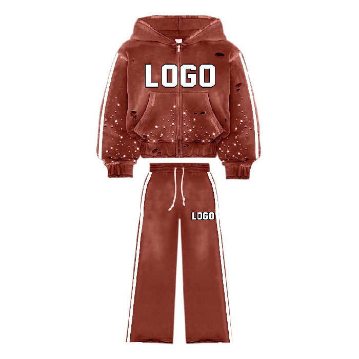 Ensemble survêtement jogging empilé personnalisé en molleton technique épais avec sweat à capuche orné de strass et pantalon de survêtement évasé