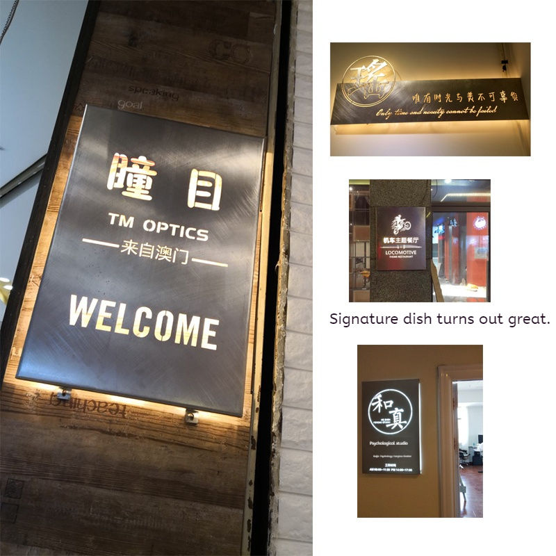 Enseigne lumineuse en acier inoxydable personnalisée, boîte à lumière creuse, extérieure, créative, éclairée par LED, étanche, écologique, suspendue, publicitaire