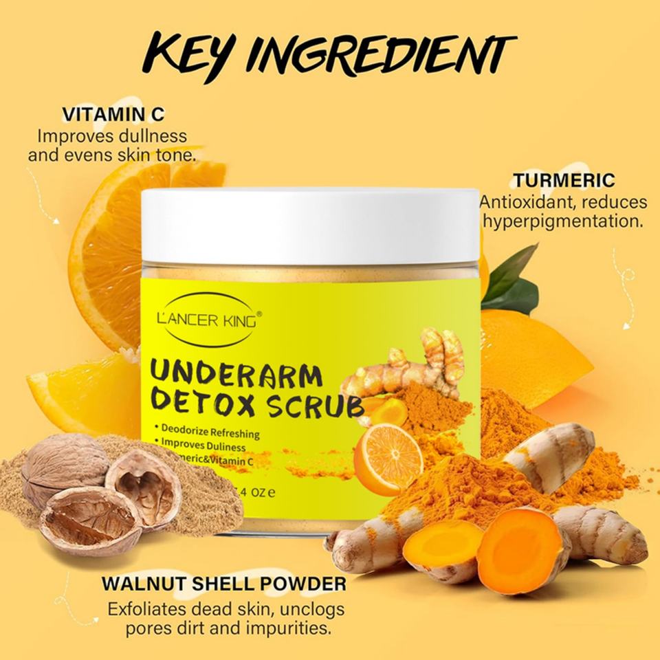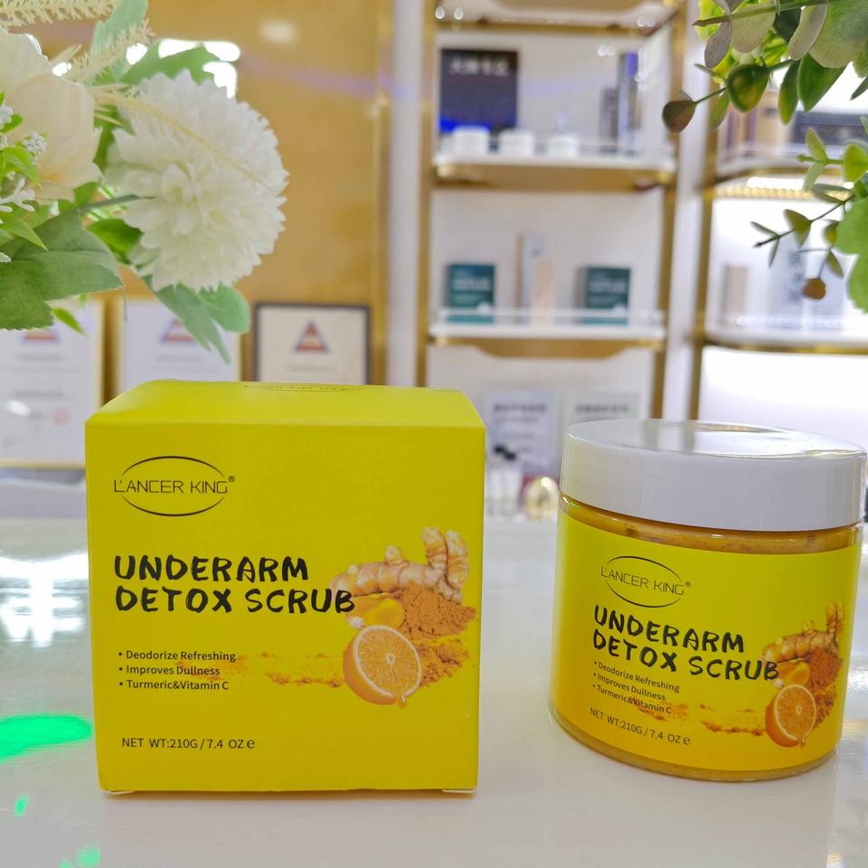 Autocollants personnalisés Gommage corporel au curcuma Exfoliation douce Désodorisant Rafraîchissant Améliore le teint terne Gommage détoxifiant pour les aisselles pour peaux foncées