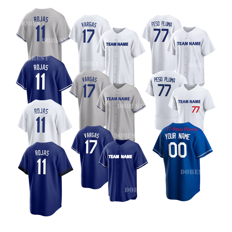 Maillots de baseball américains personnalisés brodés Los Angeles 77 Peso Pluma 11 Miguel Rojas 17 Miguel Vargas Maillot personnalisé