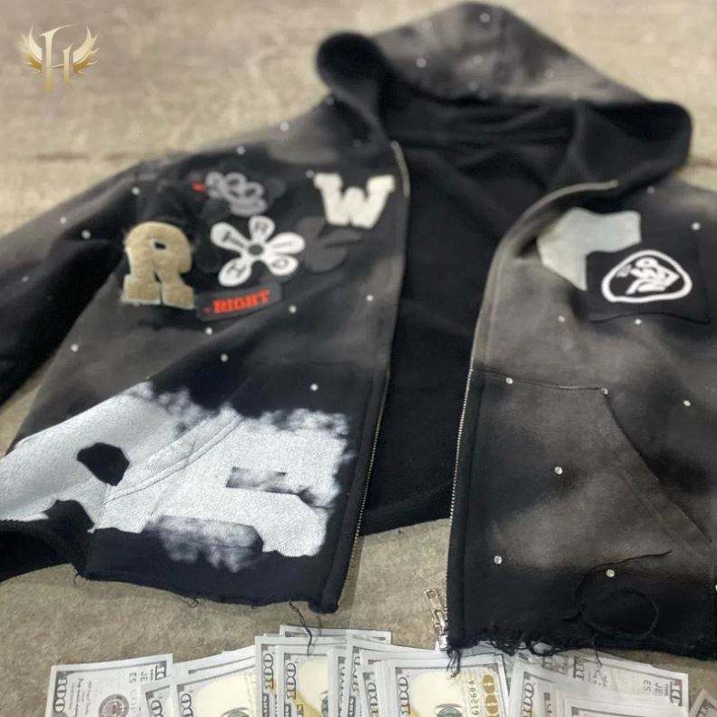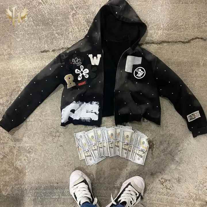 Streetwear personnalisé lavé à l'acide en détresse Chenille Applique broderie ourlet brut coupe couture soleil fané recadrée strass sweats à capuche