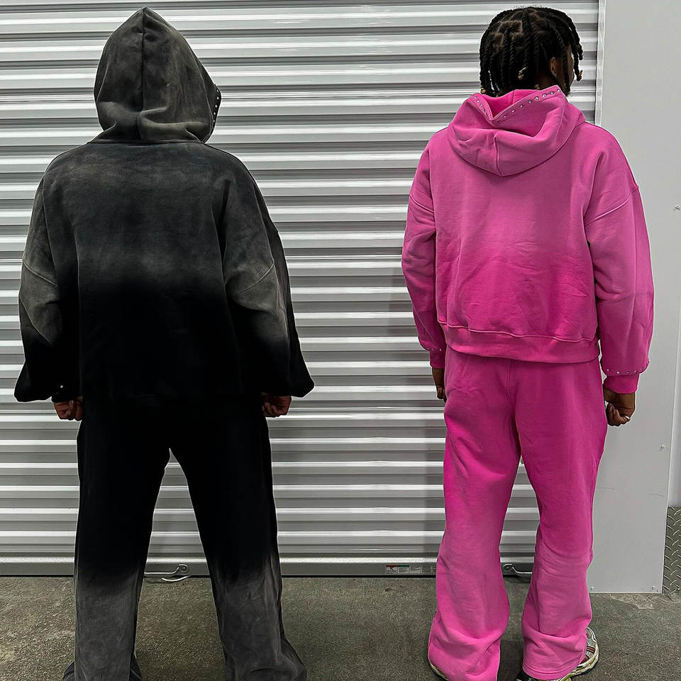 Streetwear personnalisé Boxy Fit Distressed Embroidery Sun Faded Acid Wash Zip up Rhinestone Men Hoodie Ensemble 2 pièces