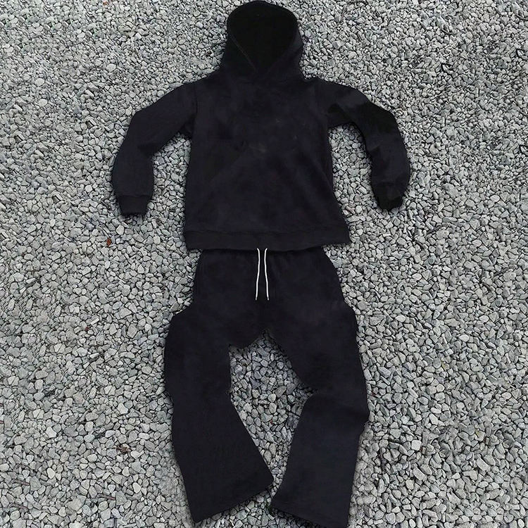 Custom Streetwear Distress Patch Flared Sweatpants Hoodie Set Acid Washed Printed Sweat Suits Drawstring Hoodies Men's Tracksuit