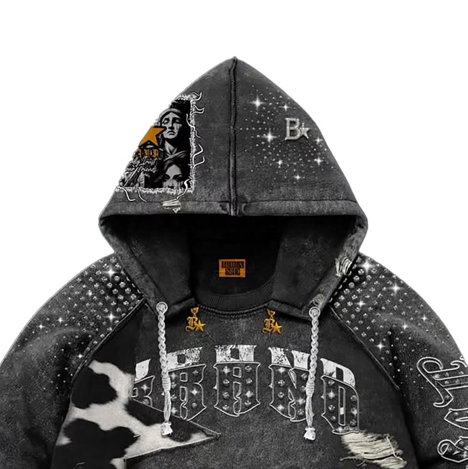 Sweat-shirt surdimensionné pour homme en coton 100% vintage, avec broderie personnalisée, lavage à l'acide, impression DTG, strass, poids lourd
